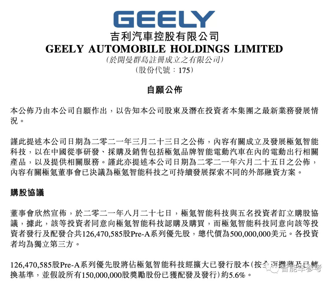 8月27日下午,吉利在港交所发布公告称,其控股的极氪智能科技与5名独立第三方投资者订立购股协议。