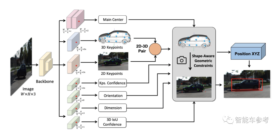 整体的网络架构如上图所示,8个分支头分别对应中心点分类、中心点偏移、2D关键点、3D坐标、关键点置信度、物体方向、维度,以及3D检测置信度得分。所有回归信息最后都会被用来恢复物体在摄像机坐标中的3D边界框。
