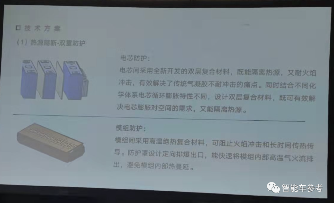 在内部也有双层绝热复合材料(电芯)、高温绝热复合材料(模组),防止一个失控波及一片的情况。