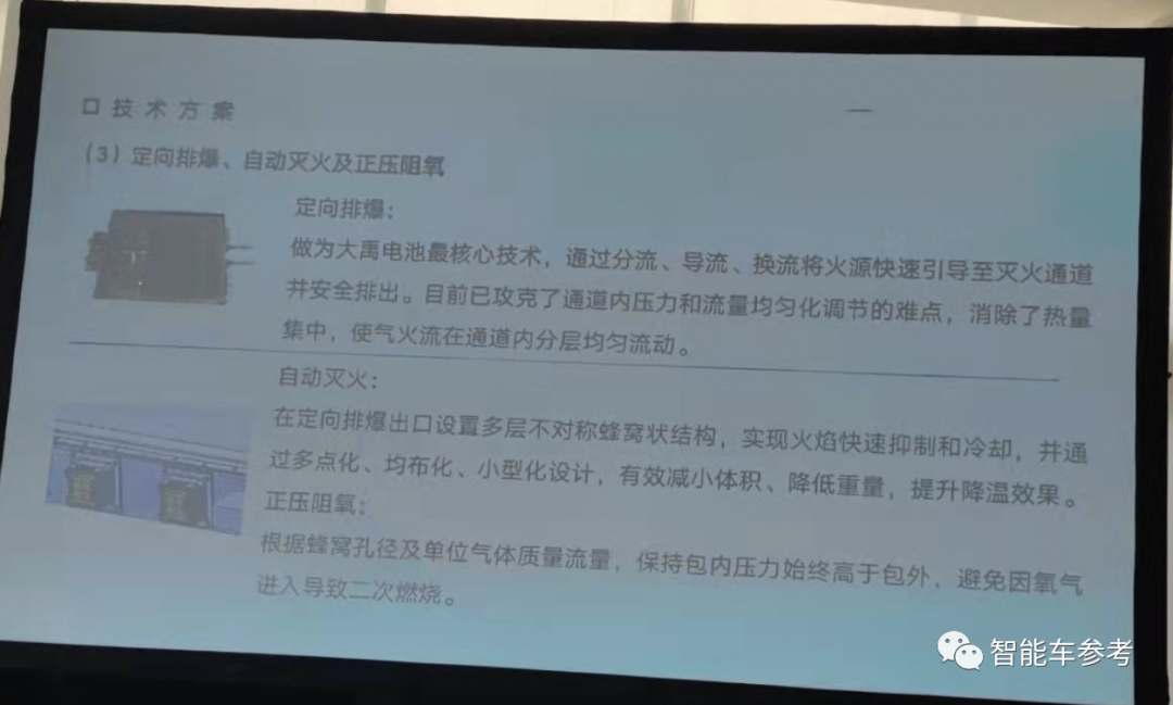“大禹”之名,意思是设计理念类似大禹治水一般,变堵为疏,避免热量气流在封闭空间堆积,快速排出电池包,“可以杜绝热失控后起火爆炸的问题”。