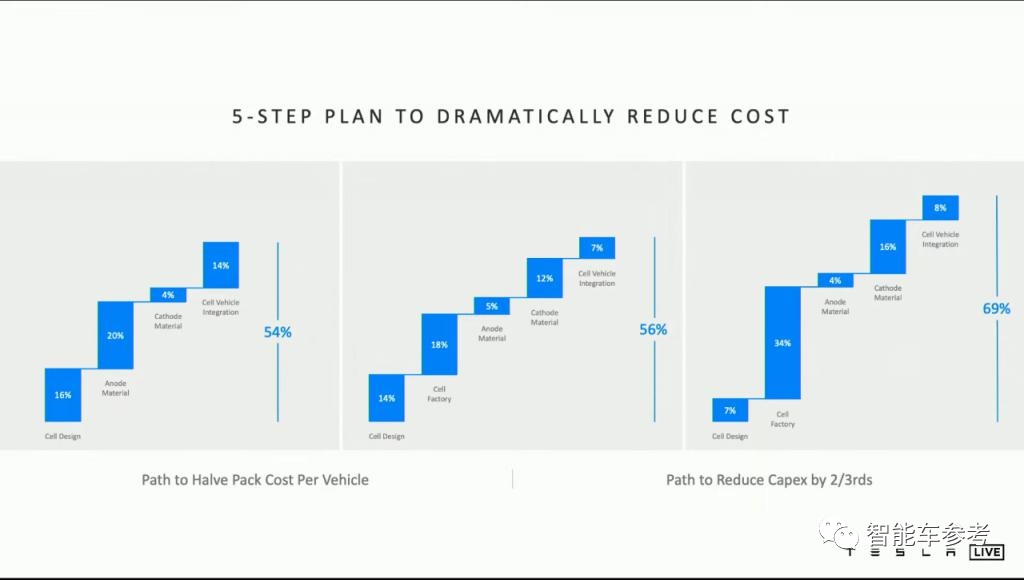 去年电池日,马斯克曾给出了新能源汽车降低成本的5步走计划,以电池切入,从材料、封装工艺、结构集成等等方面创新,最终实现电池包成本下降2/3左右。