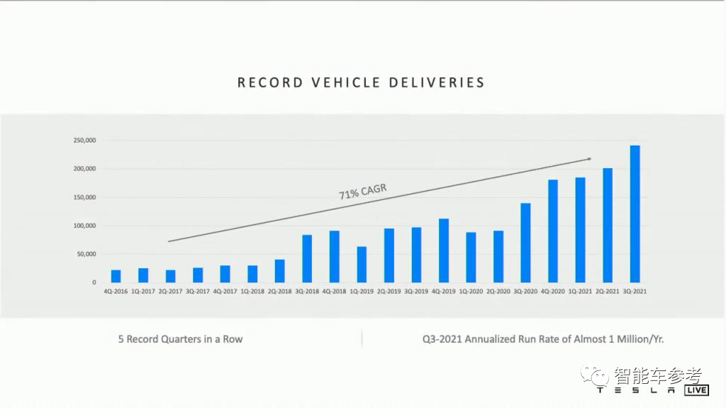 2021Q3,特斯拉已经实现了连续 5 个季度的「历史最高季度交付」,不断刷新公司的历史最好成绩。