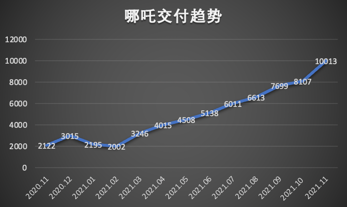 截止到今年11月末,哪吒汽车月交付量已经实现10个月的连续增长。