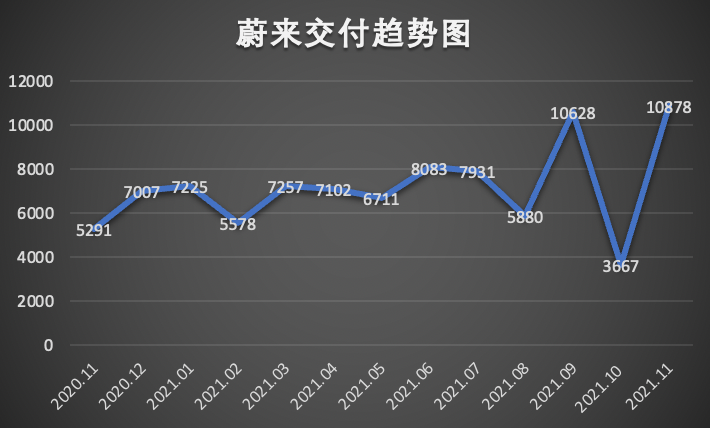 紧接着11月份,蔚来交付量重回万辆级,达到历史最高的10878辆。