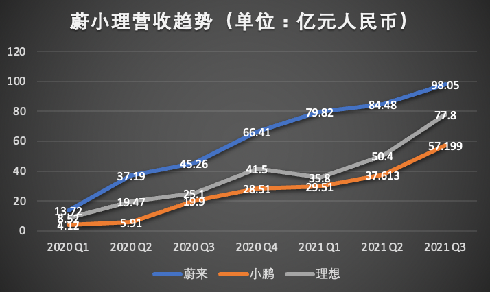 营收规模三家最高,比排名第二位的理想高出21亿元。