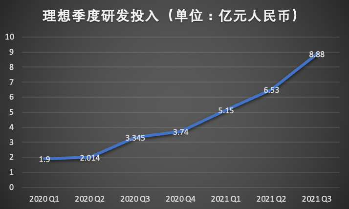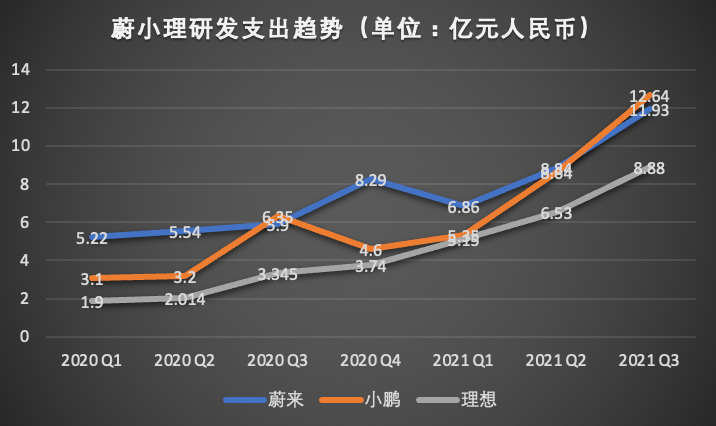 而在研发投入方面,一直靠增程式技术和单一车型打天下的理想没有蔚来和小鹏那么迫切。