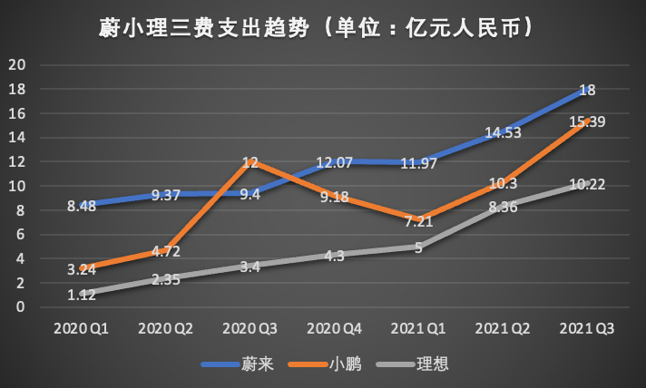 而蔚来和小鹏三费支出则高达17.92亿元和15.387亿元。