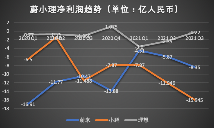 整个季度净亏损达到15.945亿元,远高于蔚来的8.35亿和理想的0.22亿。
