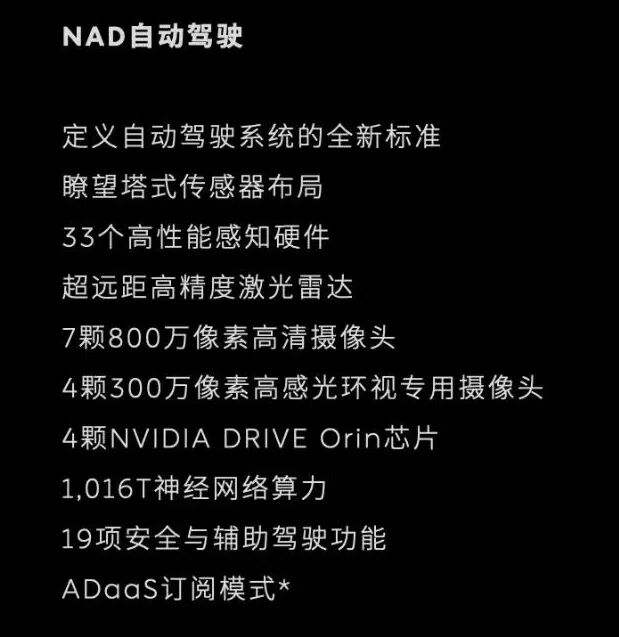 搭载包含激光雷达在内的33颗传感器,4颗英伟达Orin芯片,整体算力1016 TOPS,号称可以实现全程安全放松的点到点自动驾驶体验,最长续航里程达1000公里。