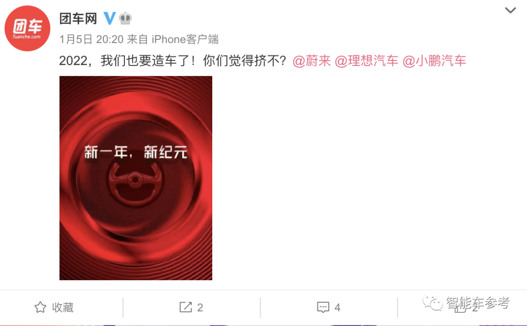 1月5日,团车网高调发布了一条微博:“2022,我们也要造车了!你们觉得挤不?”并@了蔚来、理想汽车和小鹏汽车。