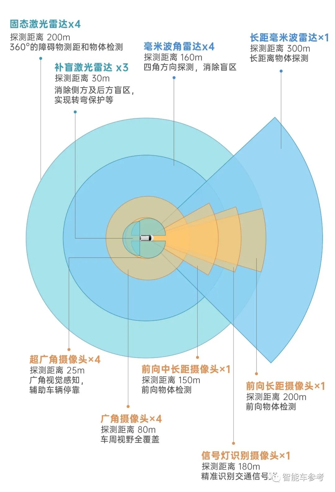 从传感器到计算硬件,都在从工业级走向车规量产,首次大规模采用了固态激光雷达,传感器总数量达23个,其中自研信号灯识别摄像头分辨率提升1.5倍。