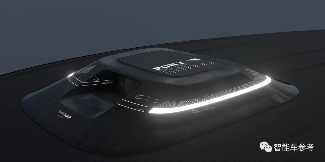 小马智行在车顶感知模块上设计了前部水平环形、后部竖向三段的概念车灯,配合一体式透明外罩,为Robotaxi营造出别样科技未来感。