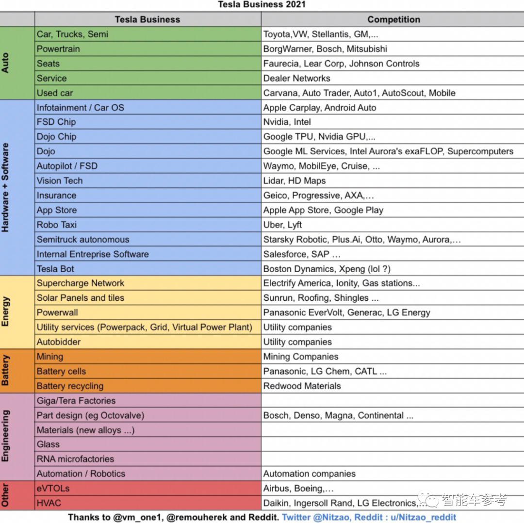 其实很简单,一张Excel表格,将特斯拉2021年的业务分为6大板块,单独列明产品,最后再附上相关赛道的选手。