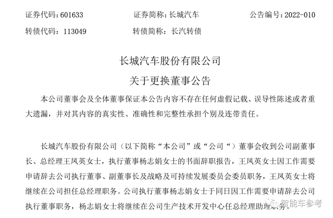 不过在长城汽车2022年第一次股东大会提名审议通过之前,王凤英和杨志娟将继续行使副董事长和执行董事职责。