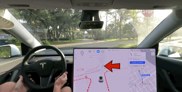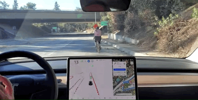 对于路上与行人类似的低速自行车目标,FSD结合导航路径采取了不一样的策略: