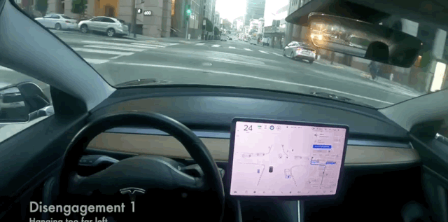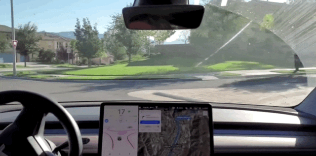 但此时一个一直等候在路边的行人开始斜穿十字路口,车辆屏幕上FSD的UI可以看到这个行人已被识别出来,但他的行为直接导致FSD Beta退出自动驾驶状态。
