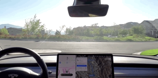 从多位车主上传的视频来看,特斯拉FSD在设置好目的地之后,依然需要谷歌地图导航规划整体路线,但路口、匝道这些决策,主要依赖系统实时构建复现的道路实况。