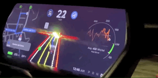 从测试结果来看,在没有明确清晰车道线的路上,FSD通过本身的视觉识别能力,描绘出了与人眼目力所及范围大致相同的路况,并据此选择行驶策略。