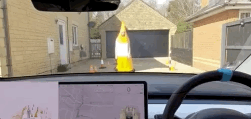 一个穿着「雪糕筒」戏服的人,站在一堆真正的交通圆锥障碍旁边,特斯拉依然识别无误。