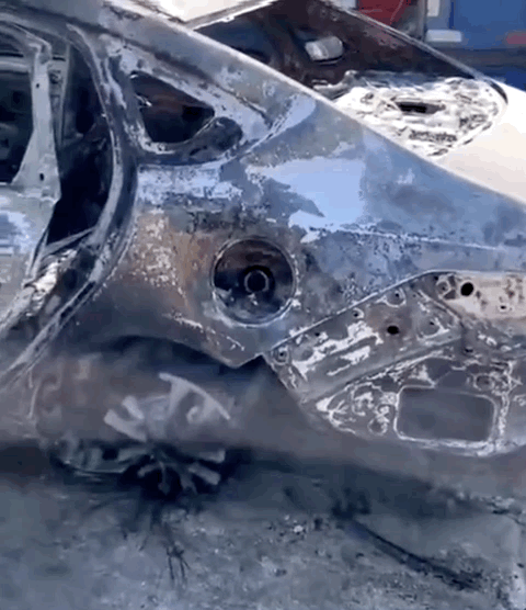 视频中,涉事车辆起火严重,只剩车架,现场极其惨烈。