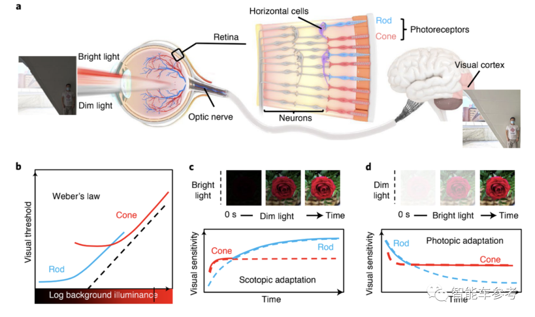 所以光照条件发生变化时,视网膜的水平细胞会控制感光点在视锥和视杆细胞之间的转换、以及光色素的产生和消失来适应。