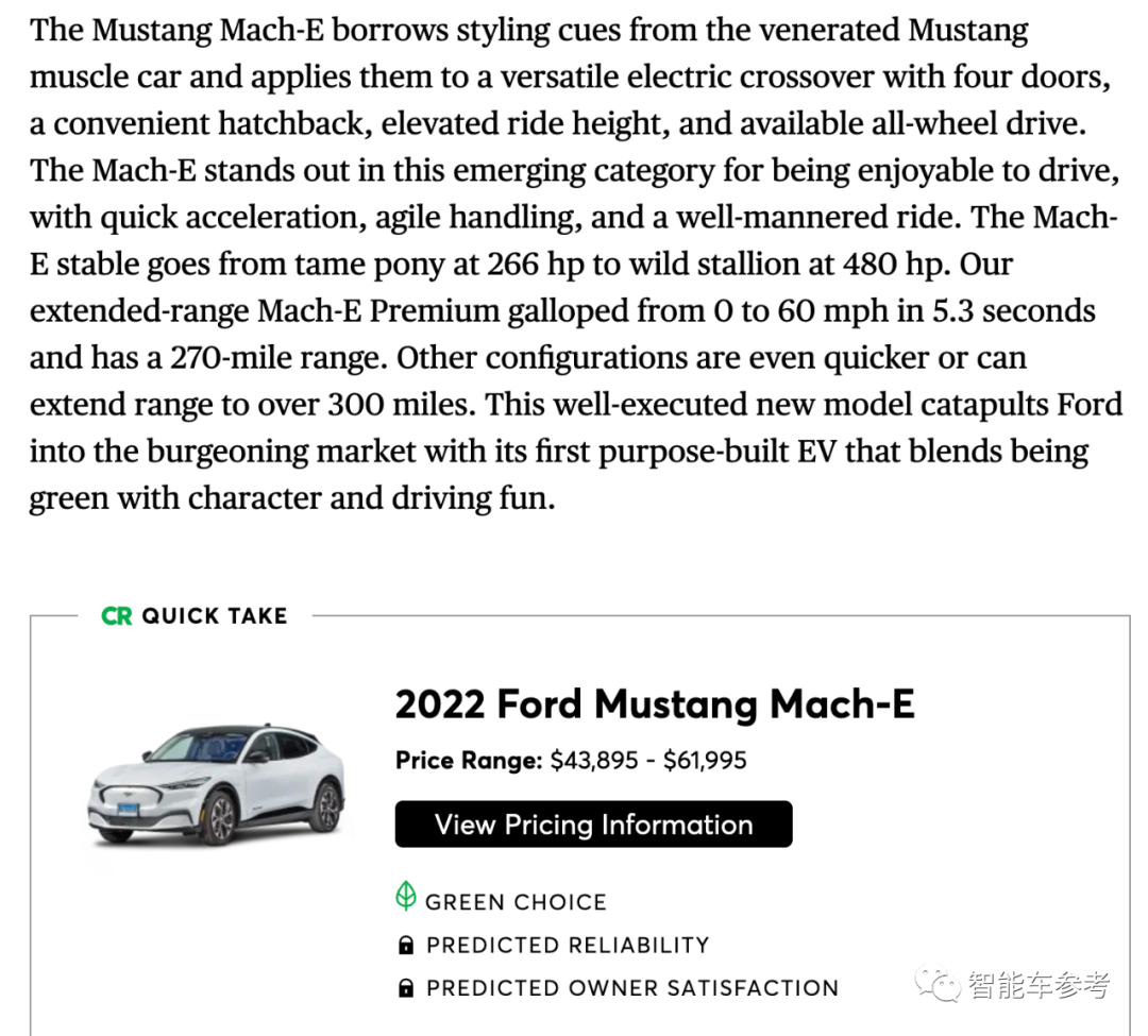 最近发布的《消费者报告》,上市一年的福特Mustang Mach-E,力压电动车销量王Model 3,成为美国人民年度最受欢迎电动车型。