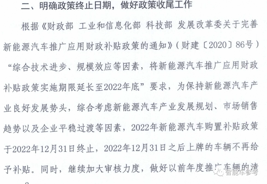 “2022年,新能源汽车补贴标准在2021年基础上退坡30%”、“2022年新能源汽车购置补贴政策于2022年12月31日终止”。