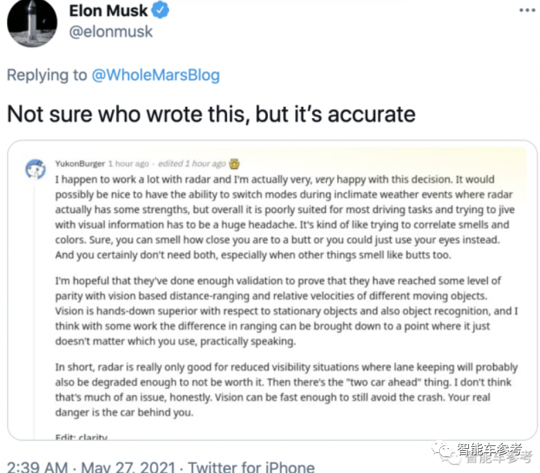 大意是,雷达感知确实在特殊天气下有优势,不过总体来讲,大多数驾驶场景下没啥用,还会因为增加冗余带来数据处理的麻烦。