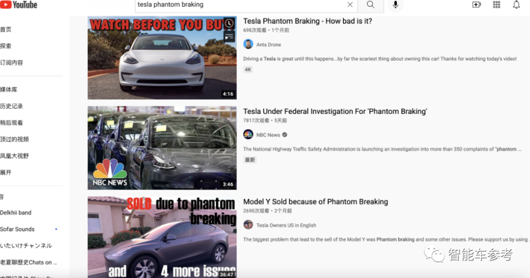 现在,在youtube上随便一搜“phantom breaking”,结果基本都是三个月内特斯拉车主们的抱怨…