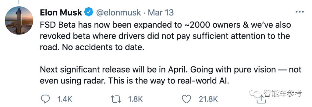 迄今为止,试用过程中没有发生任何一起意外事故。FSD Beta测试版的下一个重要更新将在4月,甚至在不使用激光雷达的情况下可以提供纯视觉(自动驾驶)。这就是打开真实世界人工智能的方式。