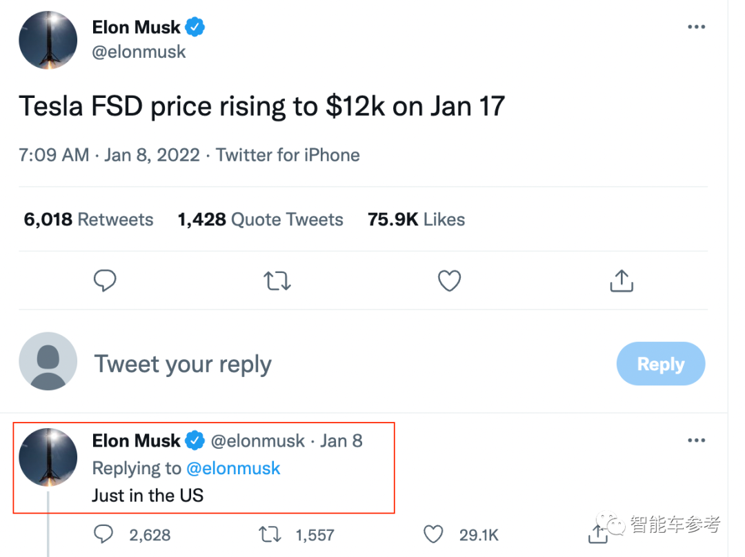 今年1月份,马斯克在推特上披露,特斯拉全自动驾驶套件Full Self-Driving(FSD)在美国的价格将从10000美元上涨至12000美元。