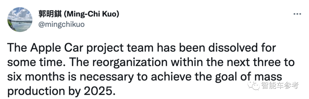 郭明錤也敲响了警钟:如果苹果要赶在2025年这个时间点实现量产,就必须在未来3-6个月内重新组织起一支智能汽车团队。