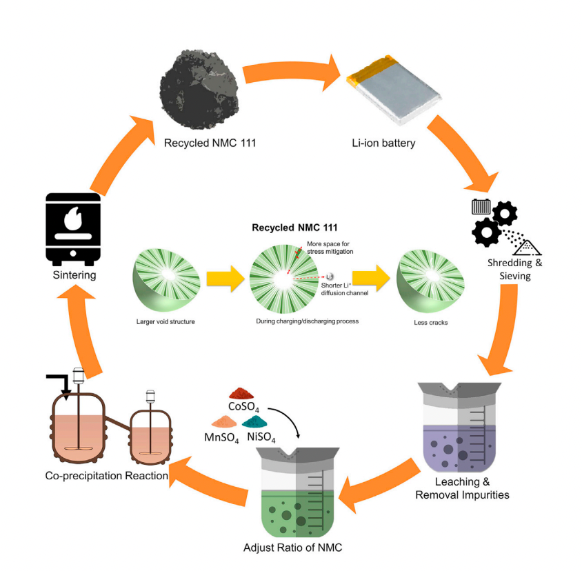 该学术团队,通过对NMC111锂电池阴极锰、钴、镍元素的回收、加工和再生产,发现用回收材料制造的锂电池,在循环寿命和充电速度方面,有更大的优势。