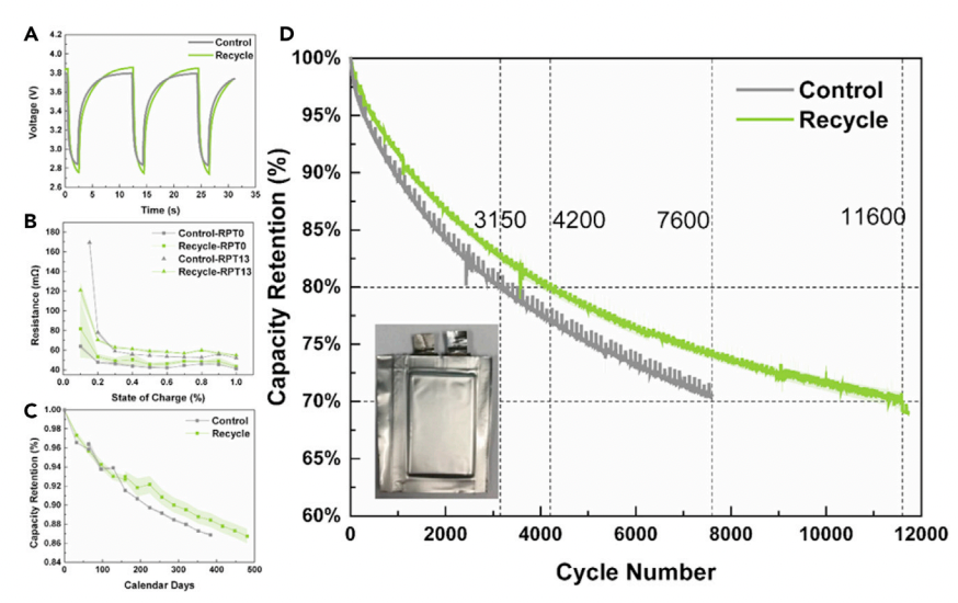 验证发现,使用回收材料制作的1A·h锂电池,在80%和70%的容量保持率下,可实现4200次和11600次循环寿命,比最先进的商业化锂离子电池提升33%和53%。