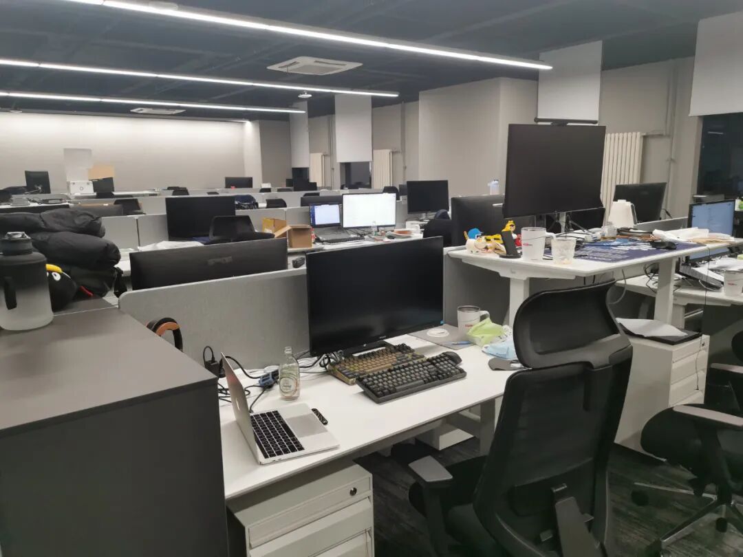 工位间没有隔板,但为程序员们标配了办公升降桌: