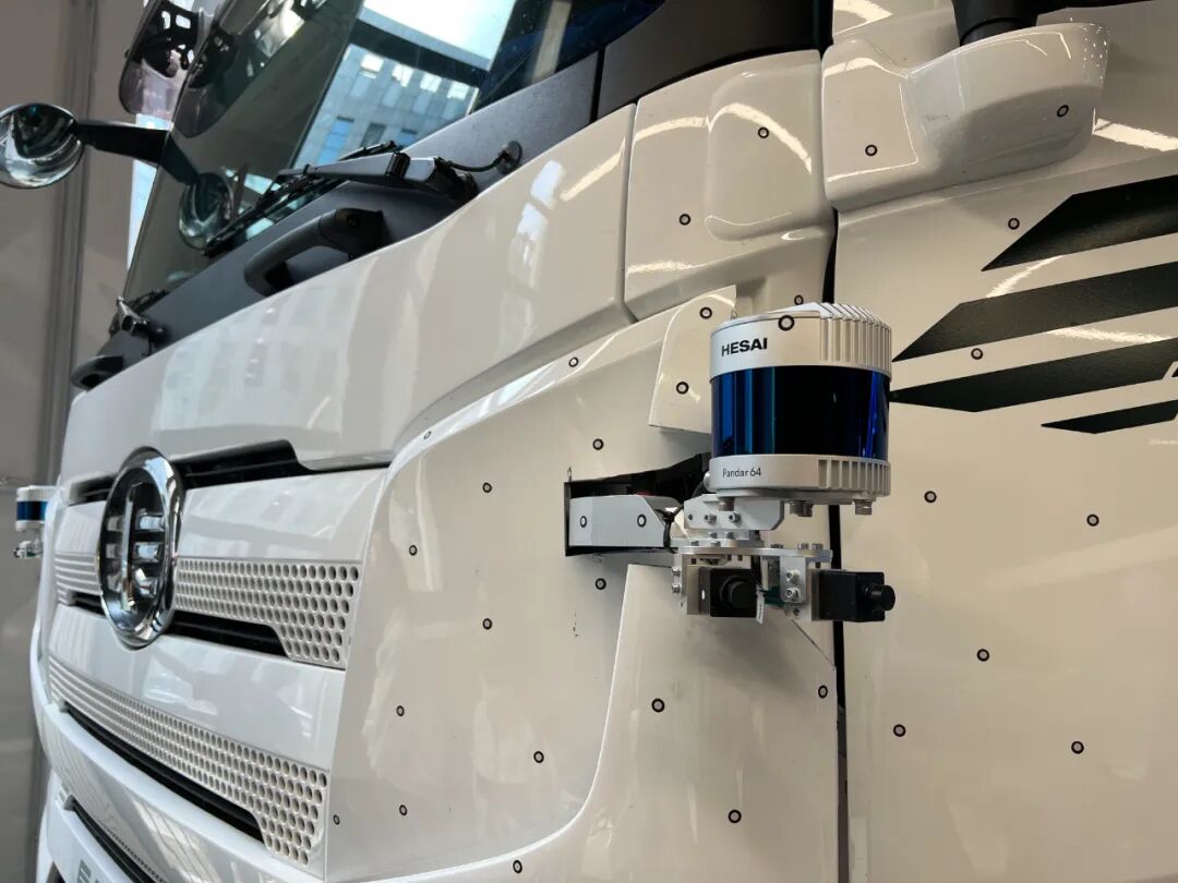 体型巨大的解放J7卡车的车头,已经完成了改装。外观最明显的是车头两侧的禾赛64线激光雷达、还有环绕车身的多个摄像头,车头正前方和两侧还有3个毫米波雷达。