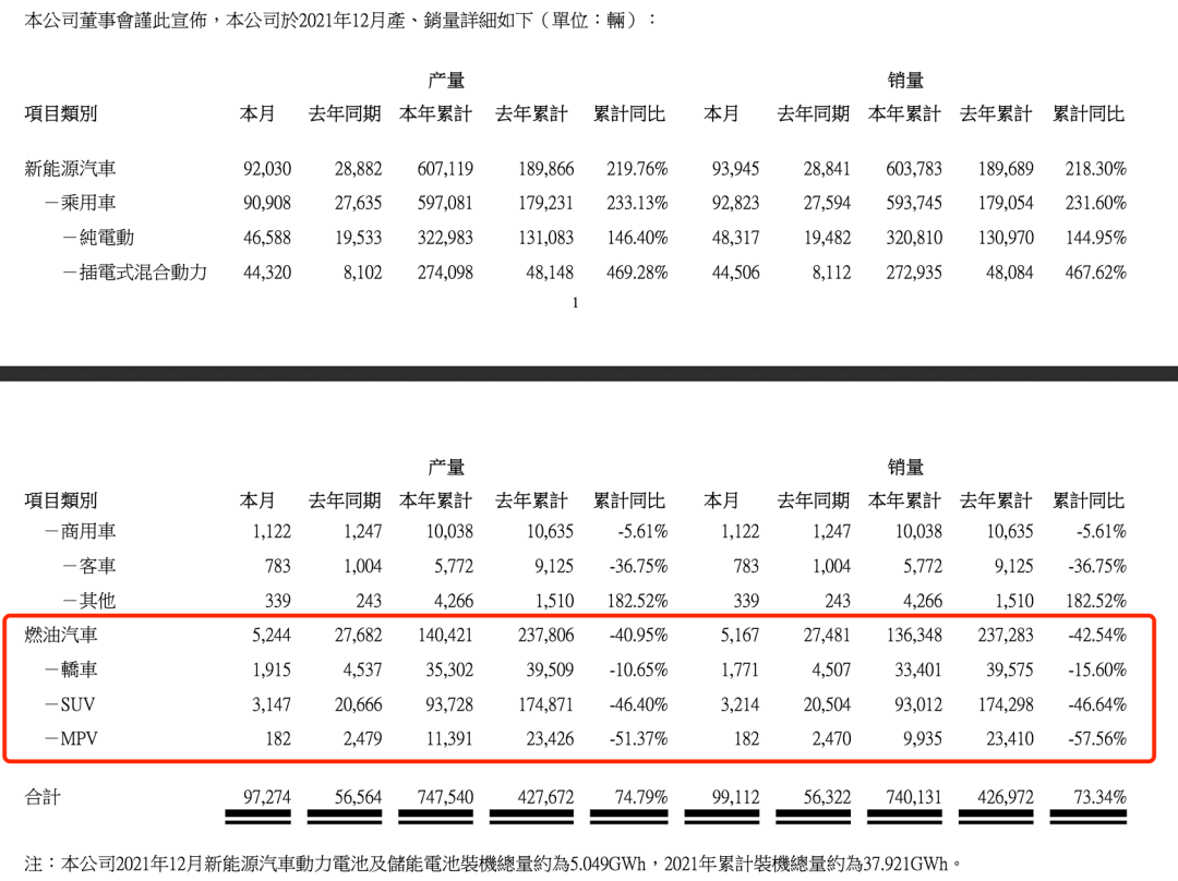 而事实上,比亚迪不仅有燃油车,在其产销数据中还是重要一环,去年产销两头都占比高达18%,并非可有可无的业务。