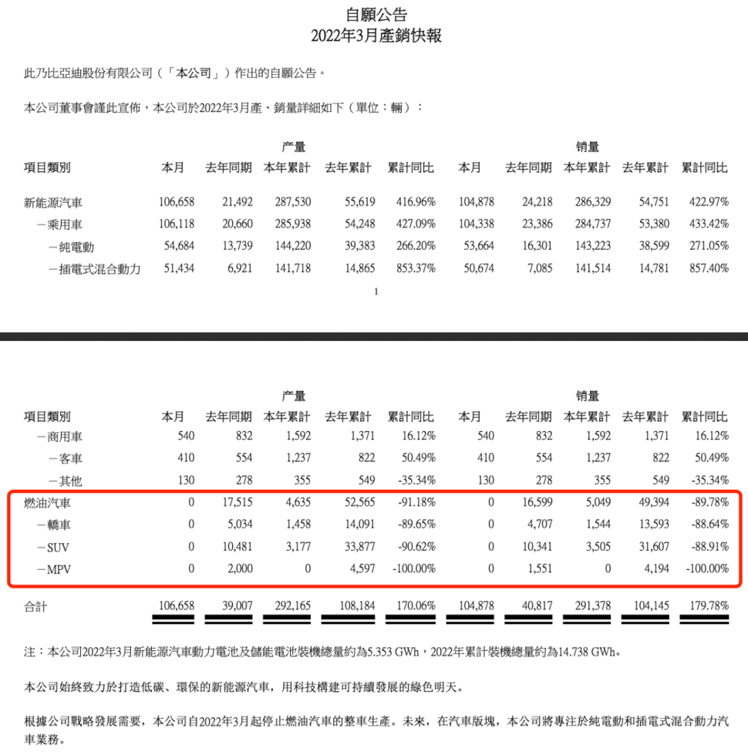 4月3日,随着比亚迪3月产销公告披露,比亚迪宣布: