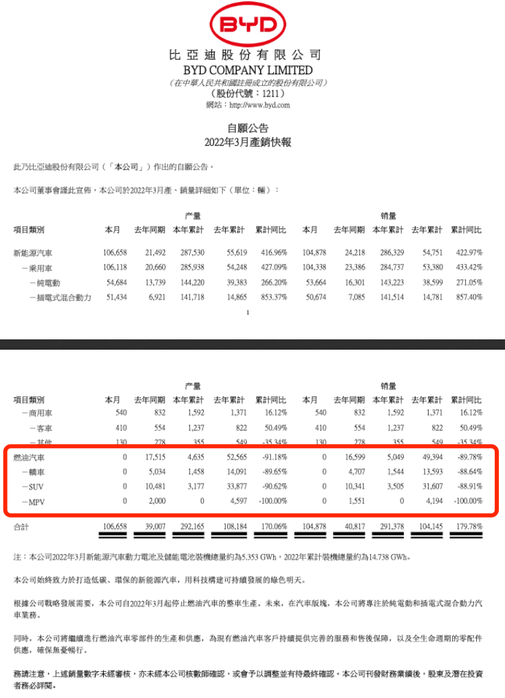 没错,4月公告,但3月就已经施行了。于是在比亚迪的3月产销报告中,燃油车相关的项目,一溜的“0”显得格外醒目。