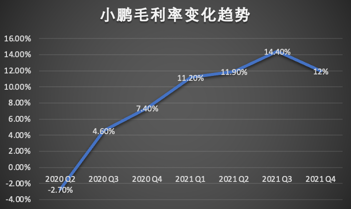 小鹏最新季度财报显示,2021年第4季度,小鹏整体毛利率为12%,环比上个季度减少2.4个百分点。汽车销售毛利率10.9%,环比减少2.7个百分点。