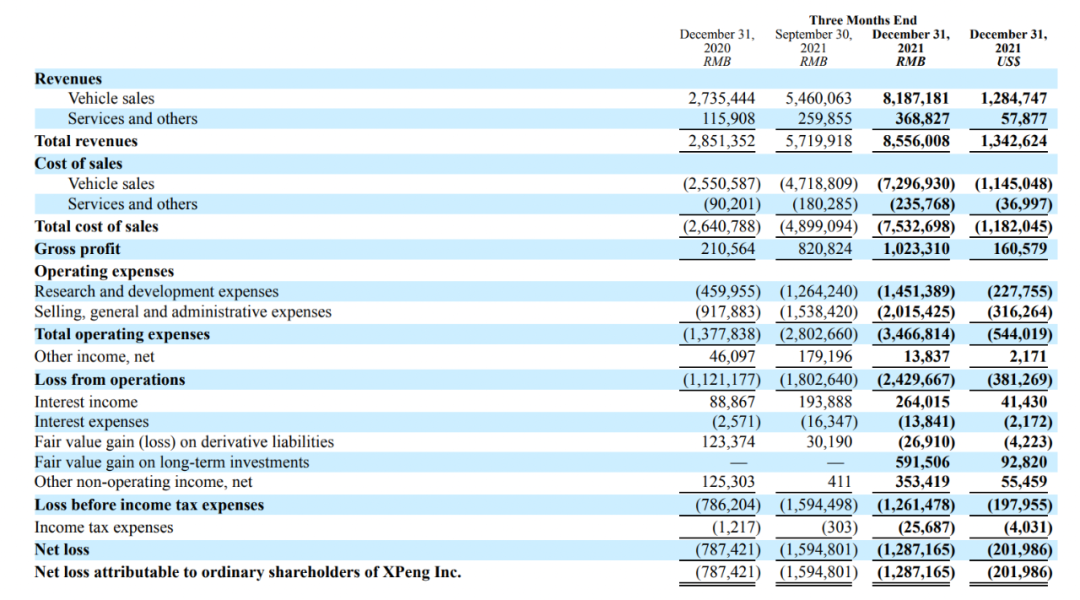 毛利率降低的主要原因,小鹏官方在分析师会议中解释,主要是第4季度电池原材料价格上升,整车生产成本增加所致。