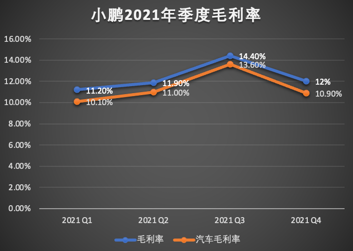 历史数据显示,小鹏2021年4个季度的毛利率,分别是11.2%、11.9%、14.4%和12%,汽车毛利率分别是10.1%、11%、13.6%以及10.9%。
