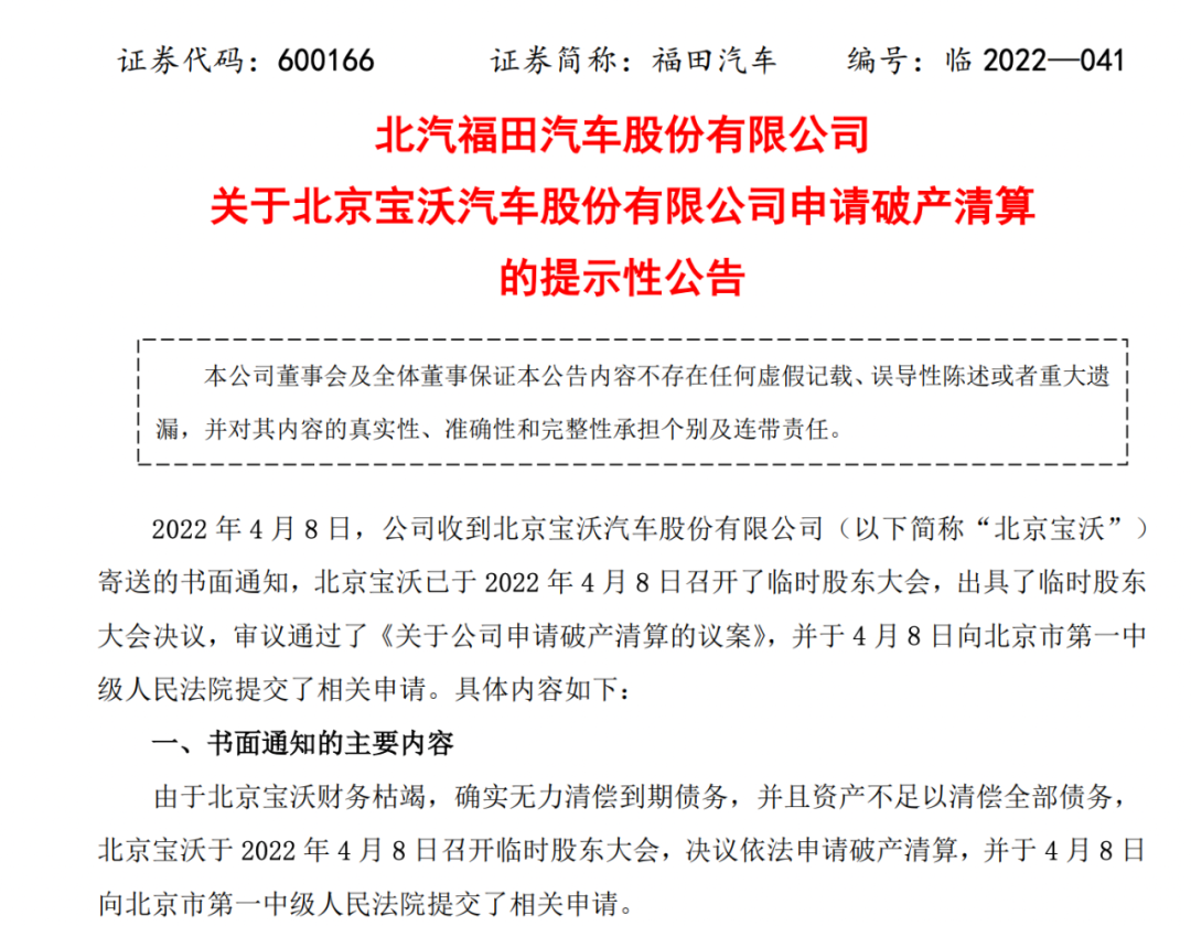 福田汽车一纸公告,宣告了宝沃汽车破产清算的命运。