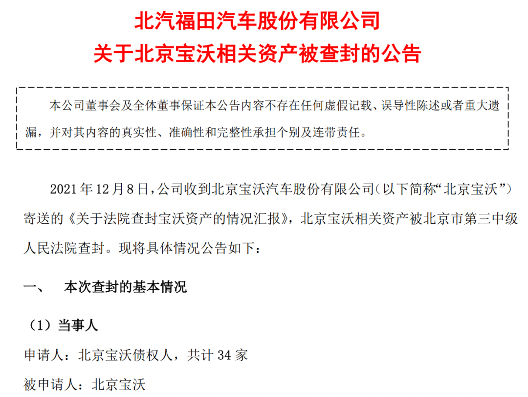 北汽福田公告披露,参股子公司宝沃汽车,自成立以来亏损严重,为偿还历史债务将资产抵债或抵押,如今账面资产不足以清偿全部债务,同时无法向外部融资,资金链断裂,无法恢复生产。