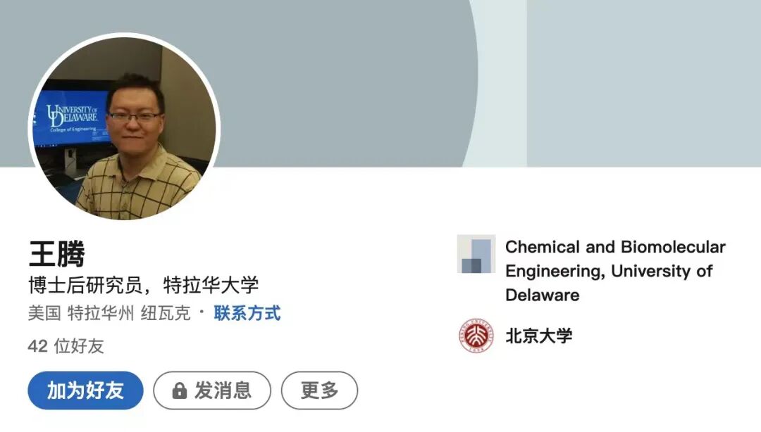 王腾,高中毕业于新疆乌鲁木齐市第一中学,2013年本科毕业于北京大学化学与分子工程学院材料化学专业。