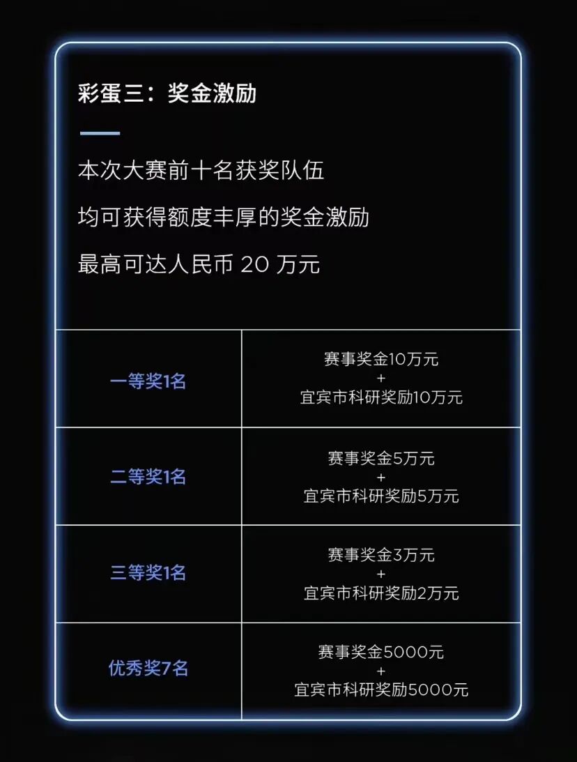 奖金方面,本次大赛对前十名进行奖励,第一名可获得人民币20万元,由赛事奖金10万元和宜宾市科研奖励10万元组成。