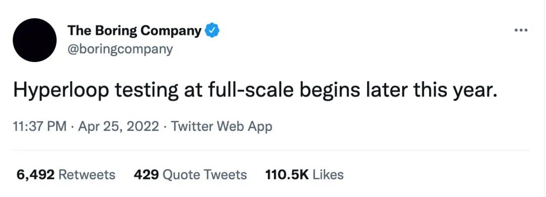4月25日,马斯克的隧道公司——The Boring Company在推特上表示,超级高铁(Hyperloop)将于今年开始全面测试。