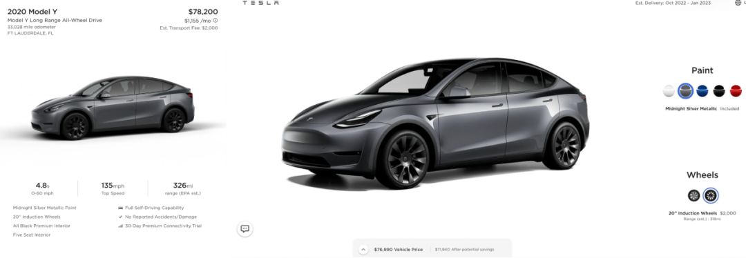 同一款车型,同样的颜色、轮毂以及FSD选装,新车价格为111740美元,较二手车价格贵了19740美元。