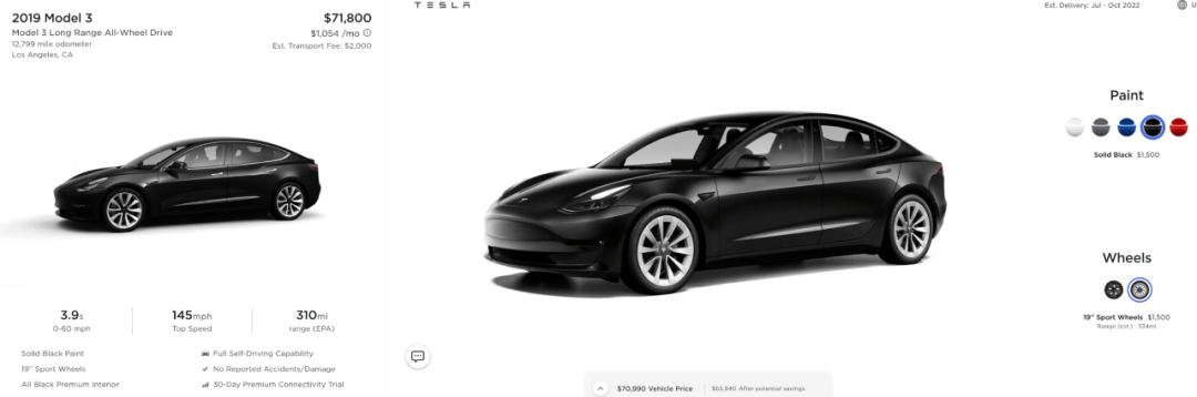 比如下面这款2019年的黑色Model 3,同样选配了FSD智能驾驶系统,官网二手价格是80300美元,也高于同样配置的Model 3新车。