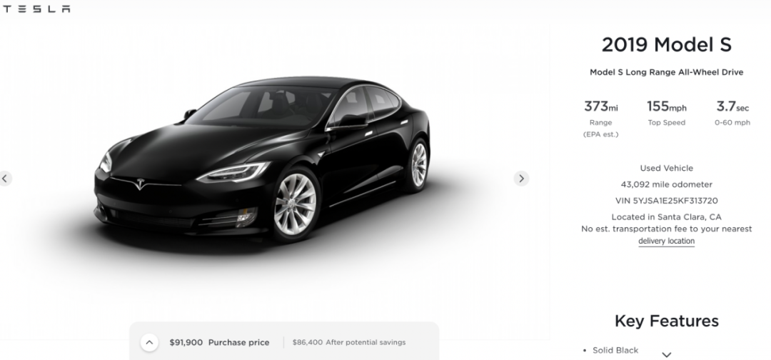 以下面这辆2019年的Model S为例,配备FSD智能驾驶套件,官网二手价格是91900美元(补贴后售价)。